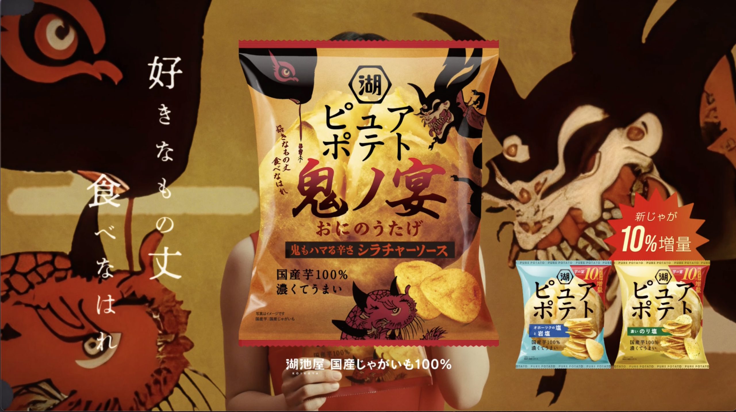 楽曲「鬼ノ宴」の中毒性のあるメロディとポテトチップスを食べる咀嚼音がクセになる、“やみつき”なCM。